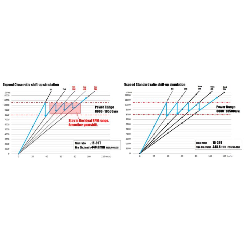 Rapports 3, 4 et 5 recalibrés pour rester dans la plage de régime idéale entre virages serrés et lignes droites.