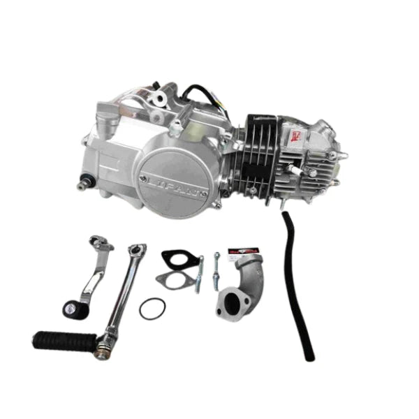 Moteur Lifan 125cc. Embrayage manuel sur vilebrequin. Démarrage au kick. Carter gris, cache pignon fourni. (inscription 124cc sur le moteur) Pipe admission fournie avec le moteur. Boite 4 type 1N234, l'allumage fourni du 12 volts pour l'éclairage et la recharge batterie.